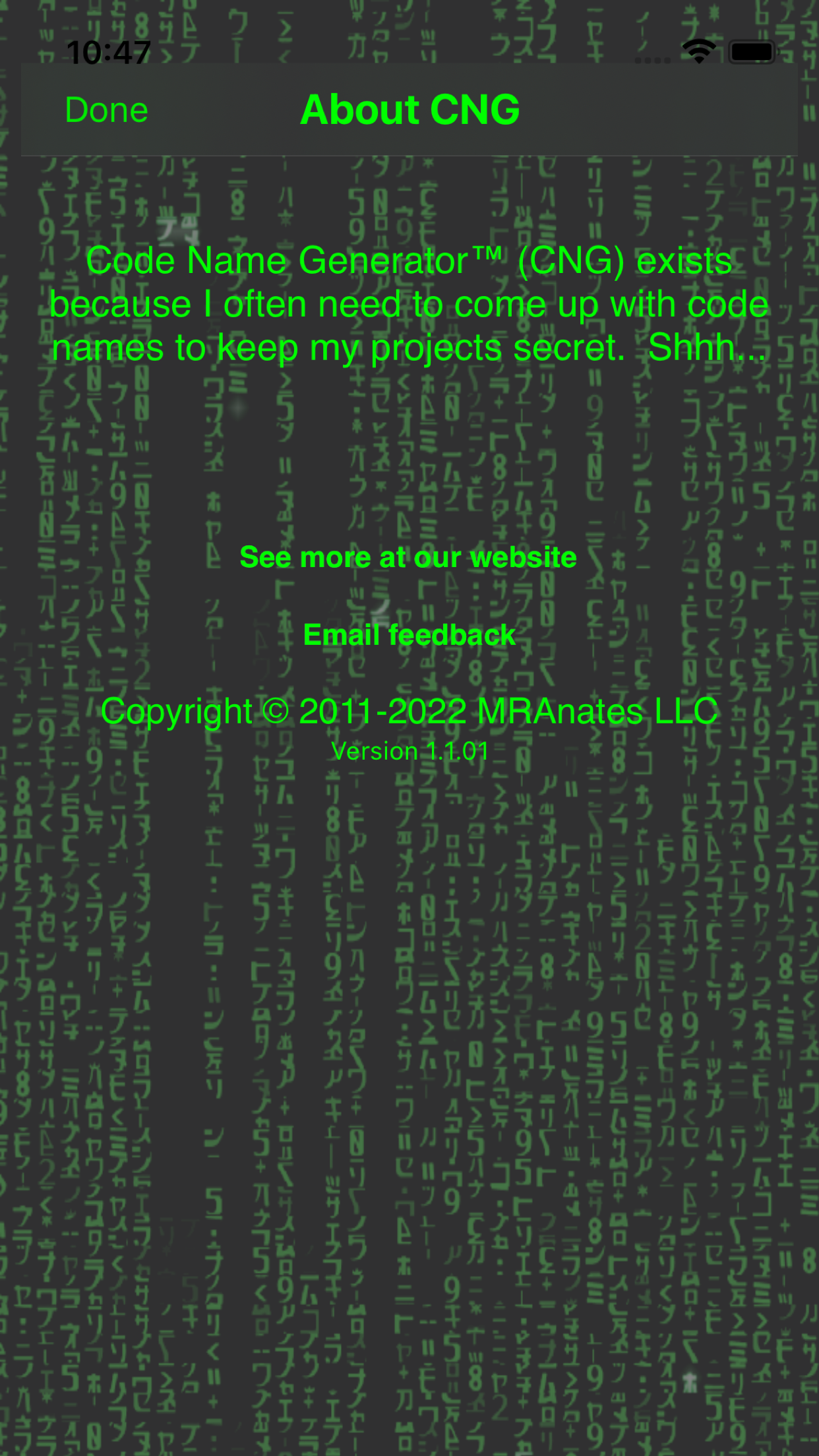 Version 1.0.1 had 20,000 different code name possibilities. Version 1.0.2 had 50,000. Version 1.0.4 has over 100,000 combinations! Version 1.0.10 now has more than 125,000 different combinations! Version 1.0.11 now has more than 181,000 combinations! Wow!