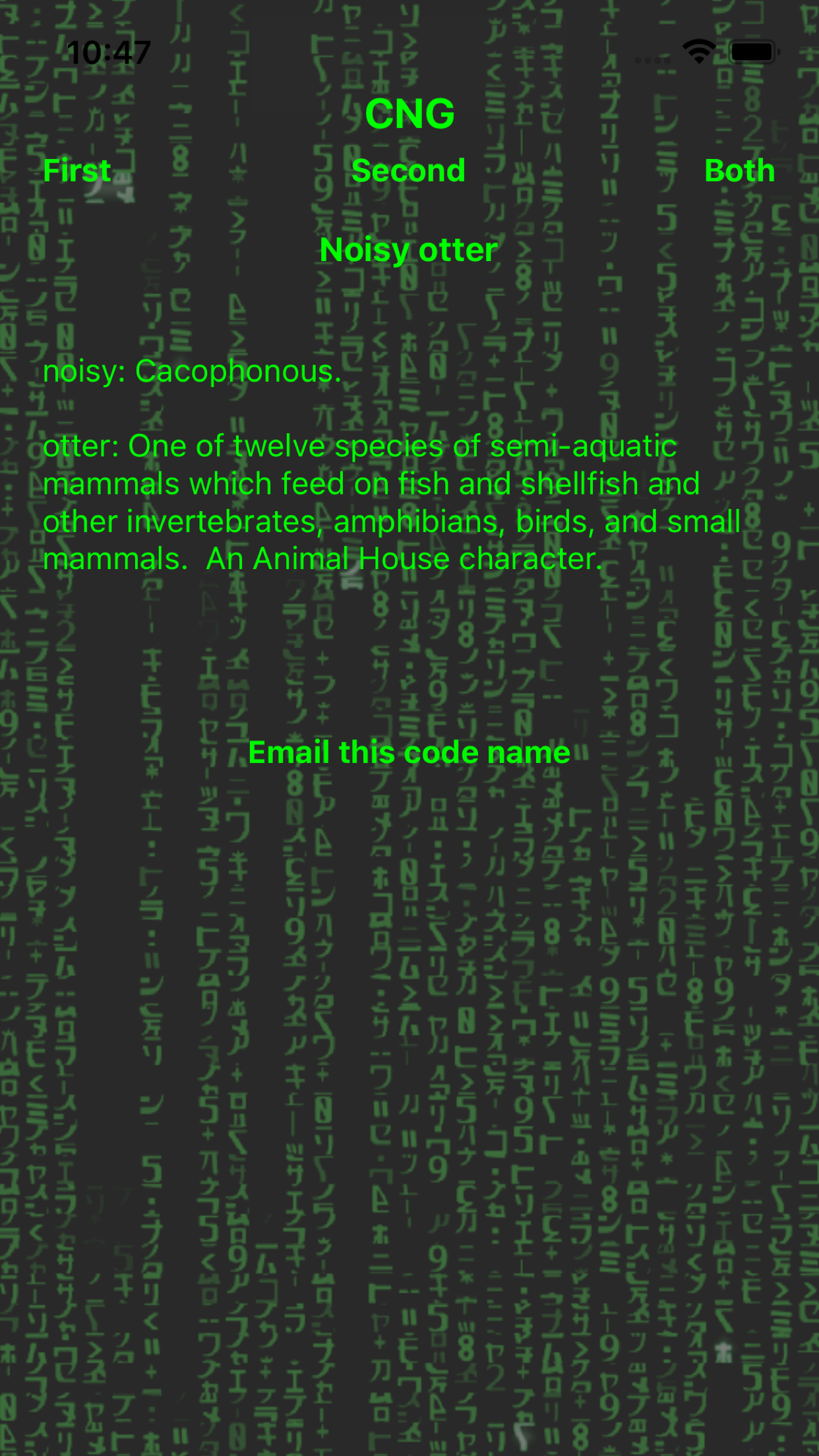 There are handy definitions to tell you what the words mean separately, if you care, and when you find a code name you like, you may mail it to yourself.